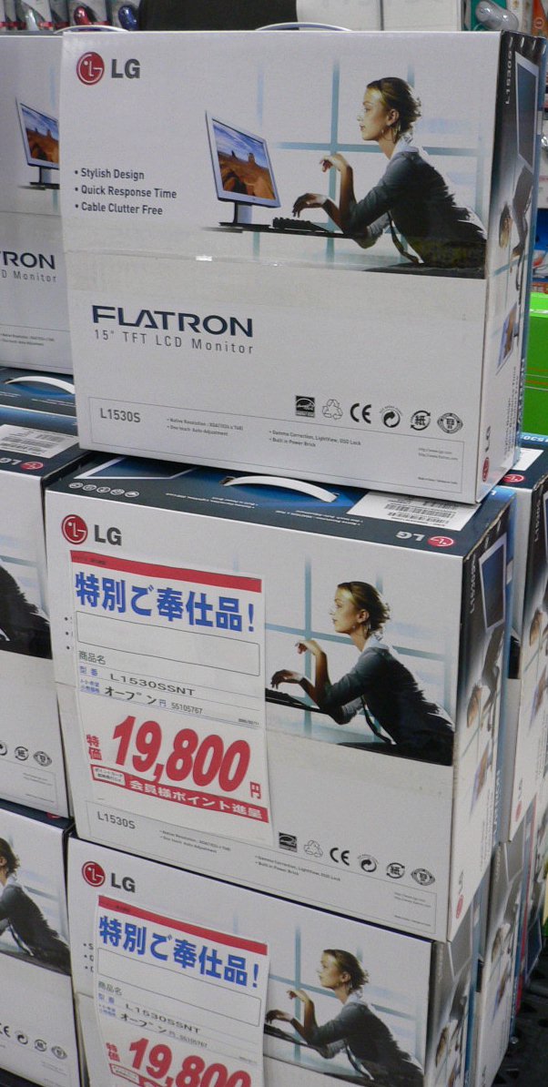 他にもSOTECブランドの17インチ液晶ディスプレイ L7PAS3-G3(JoshineWeb) 27,800円というのもありました.この製品の評判や相場は調べてませんが,他のお店にも似たような値段であるようです.メーカ製PC本体とのセットになるCRTが出回ったりしていていましたがこれもその類みたいですね.少々昔の感覚で見ていると液晶も安くなってますね.お店はJ&Pテクノランドの4F.