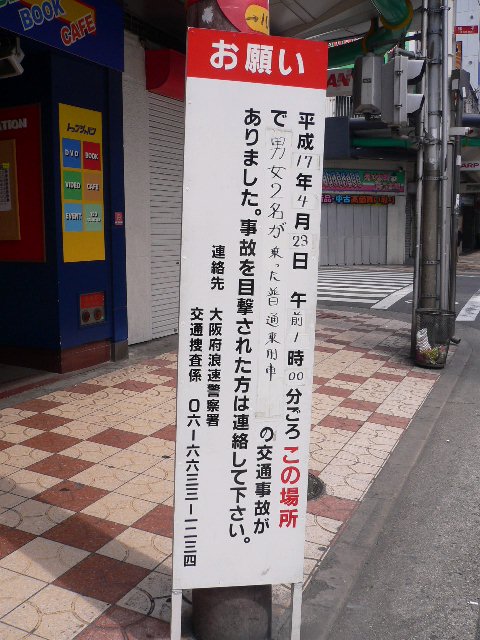 詳細不明ですがトップジャパン日本橋店前で04/23に事故があった模様.目撃者を探しているとの看板がありました.記事 "2005年04月24日アーケードの支柱が破損している 自動車事故?" の件でしょうか.後日,警官が現場を確認している場面を見ましたが当事者がそのまま逃走したのか?