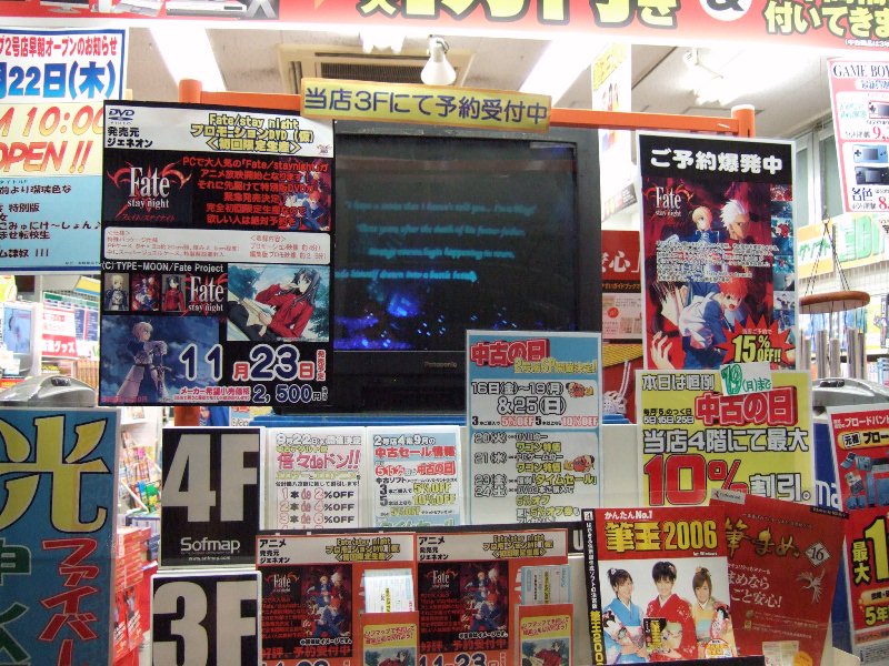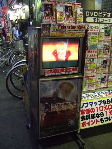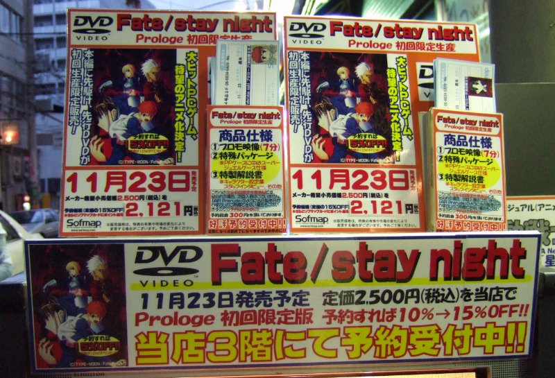 Sofmap大阪日本橋店4号店でも店頭にFate/stay night プロローグDVD(仮)予約受付POPあり.PC版(Fate/stay night,Fate/hollow ataraxia)がでて,TVA版(Fate/stay night)が出たなら,この流れで行くとPS2版はいつでるんでしょうか.(いやそんなこと決まってないし)
