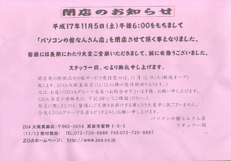 11/12 大阪箕面店が新規オープンとの事なので実質移転のようです.しかし日本橋エリアとしては巡回店が減るし,値段チェックでは現金価格では結構安い部類のお店だったので残念です.ZOA,オパソコンの館時代から数えると12年ほどこの場所で営業していたそうなので結構長かったですね.また日本橋に復活する可能性もあるようなので,その時はオタロードのど真ん中あたりお願いします.