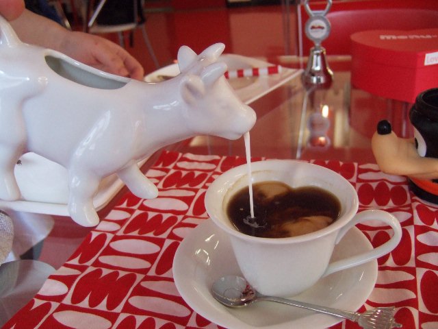 コーヒーのミルクの器が牛だ.室内の装飾や外観もそうだが食器にも凝っている.