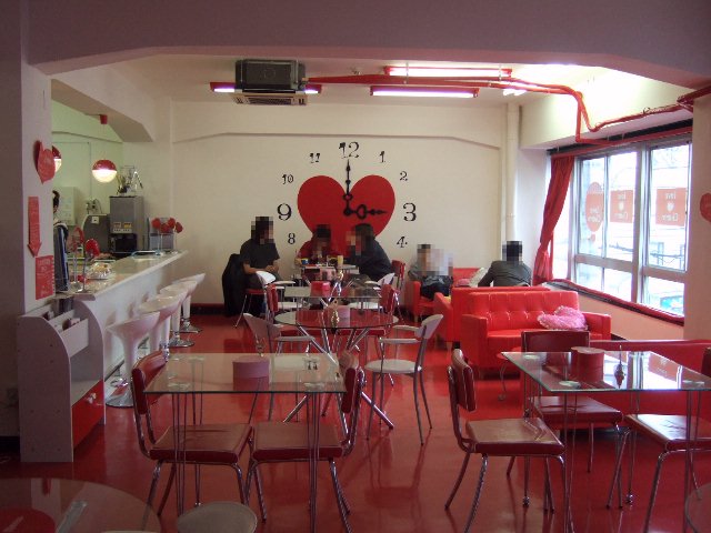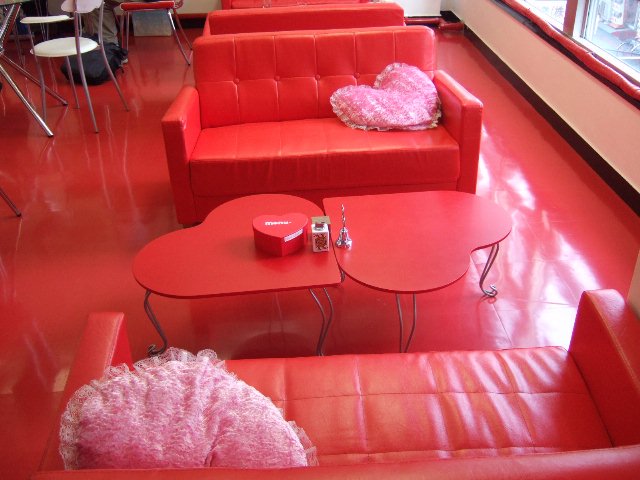 店内の様子.赤を基調にデザインされている.お店の方が全てコーディネートされたとのこと.