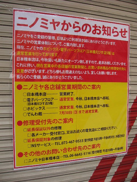 ニノミヤ日本橋本店のシャッターに貼られた各店の今後の告知.関連記事: