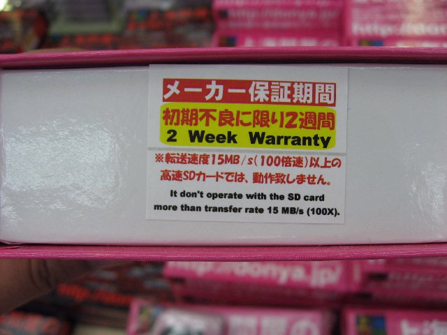 側面に "初期不良2週間" , "15MB/s(100倍速)以上のSDカードでは動作しない"との注意シールがある.昔々,どこのメーカーが分からない安価なMP3プレイヤが出回りだした頃,えらく不安定な動作で怪しげな作りだった頃から比べると安価な製品も進歩しましたね.あのころはメディアはCompactFlashでした.あ,おなじ物を買ってがっかりしている人見つけた.ちなみにこいつ,性能云々以前にジャックの固定が半田付けのみの強度で行われていて使っていると直に接触不良になります.半田コテを当てて付け直してやれば復旧しますが素晴らしい安普請加減にうっとりしたものです:-(