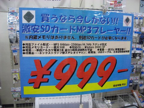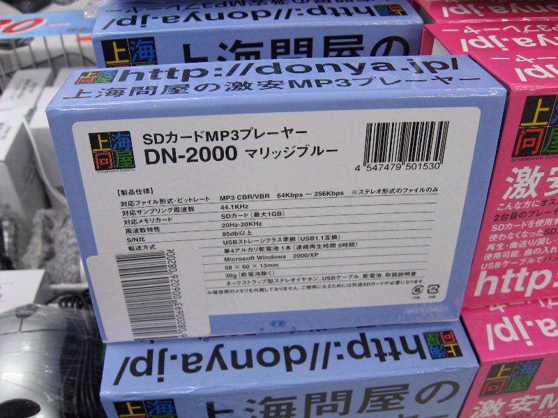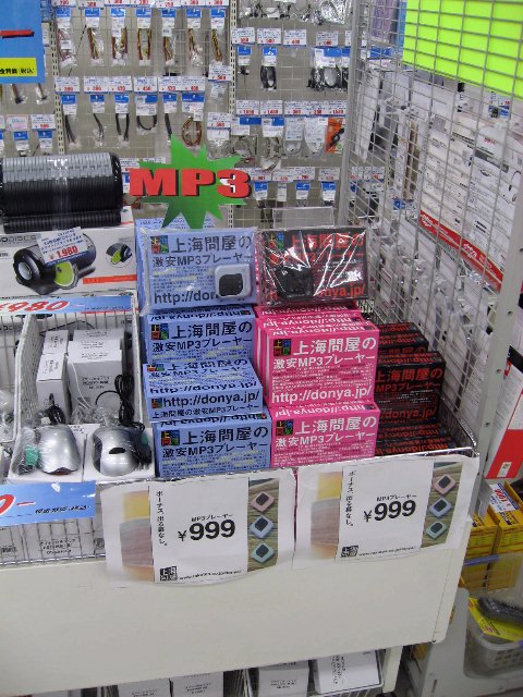 店内に入ると,メモリカードの事は忘れて,上海問屋の激安MP3プレーヤーと分かりやすい名前のMP3プレイヤを見つけた.値段は999円.Webでも販売しているみたい.