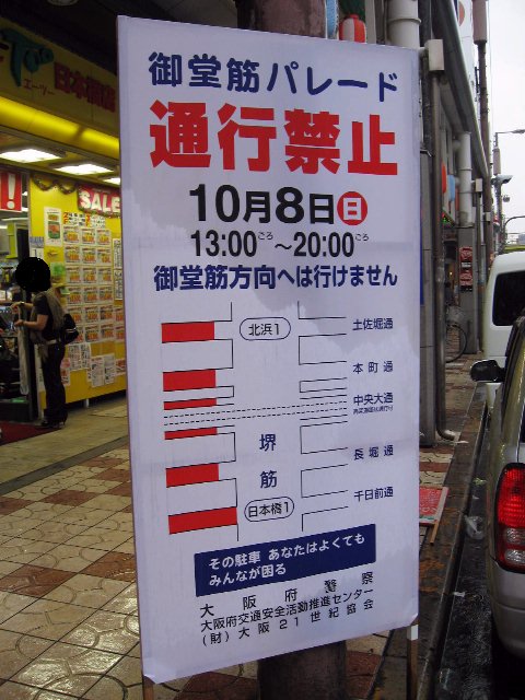 さあ明日は御堂筋パレードですよ.天気が悪いみたいですが晴れるかなぁ.日本橋に車で来る方は告知看板にあるように通行止めに注意(PDF)だ.